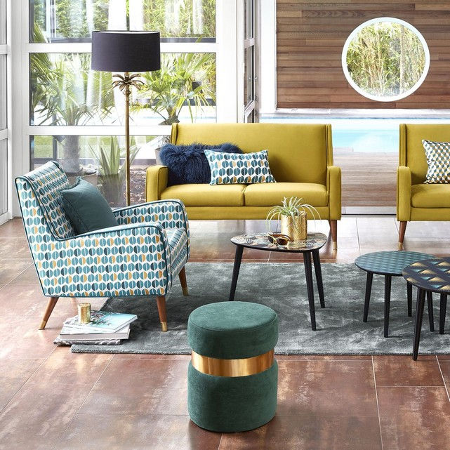On embraye avec ce canapé 2 paces au style résolument vintage sur lequel on craque littéralement. ici il est associé à du jaune moutarde mais si vous n'aimez pas cette couleur, il y a bien d'autres façons de le mettre en valeur dans un intérieur.